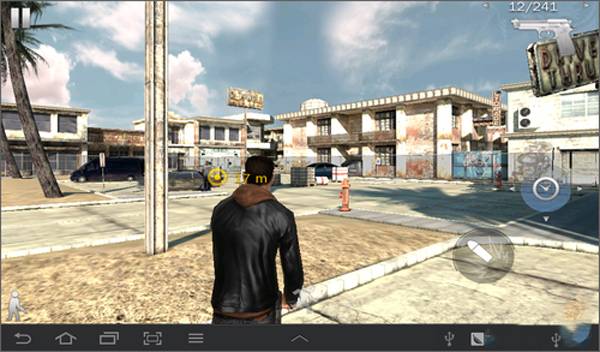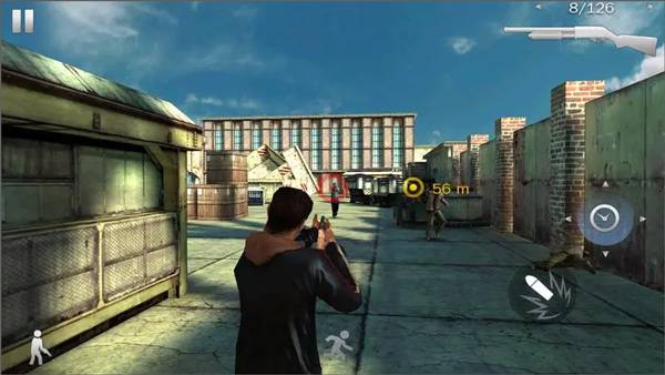 3、 然后就是游戏里面的,屏幕中间有一个小人按钮也就是跑步的键子但是在任务模式中用得到这样的键子并不是很多,因为我们玩游戏的时候也是不会去花太多的时间在一个关卡之内。在右边的地方就会看到一个子弹形状的东西那就可以说是作为玩家对敌的一个按键了