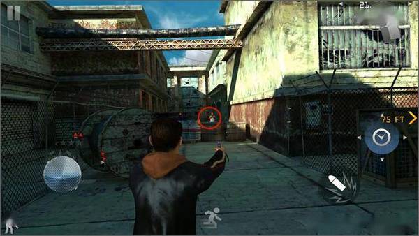 2、 右边有一个像钟表一样的按钮就是慢镜头的按键,在游戏中可以放慢敌人的动作也可以将我的人物动放慢,正常情况下只要是楼上面跳下来就会有这效果对于玩家是特别好的事情。