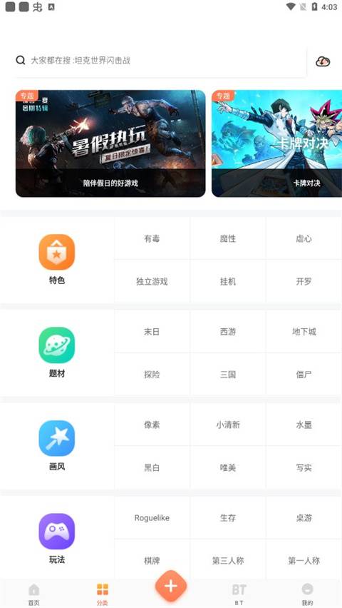 3、 我们找不到玩什么游戏的软件内有各种分类可以很快速帮我们找到想玩的游戏末日手游、像素手游、生存手游、动作手游。