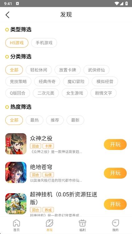 2、 发现页支持分类筛选游戏并提供丰富类别选项