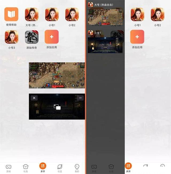6、 多开管理,需要打开别的应用的时候,直接退回桌面,之前打开的应用就会在手机上小浮窗的形式出现,一边添加需要打开的应用,这边开启就可以了同时多个游戏/应用在玩,多开浮窗处有最小化和全屏的按钮,点击【x】就关闭已经打开多开的应用,点击【-】最小化到侧边栏,点击中间【口】方框就会回到全屏画面。