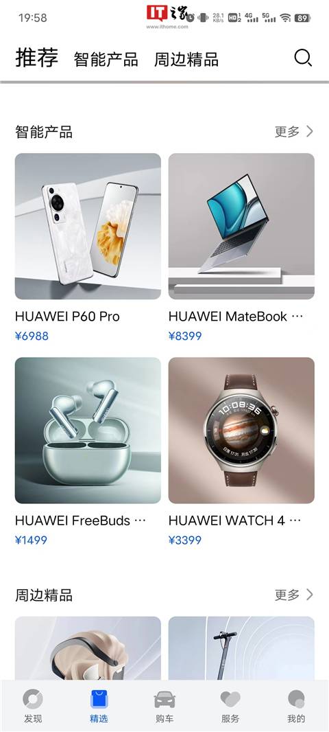 2、 精选版块设为“购物频道”,提供华为旗下各类产品购买服务,“周边精品”包含四款智选产品