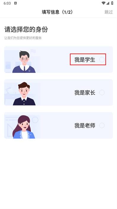 1、 首先,进入应用后根据自身身份选择不同选项,小编将以【我是学生】按钮进行演示