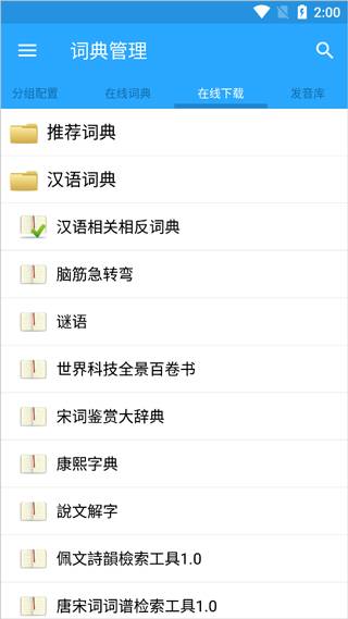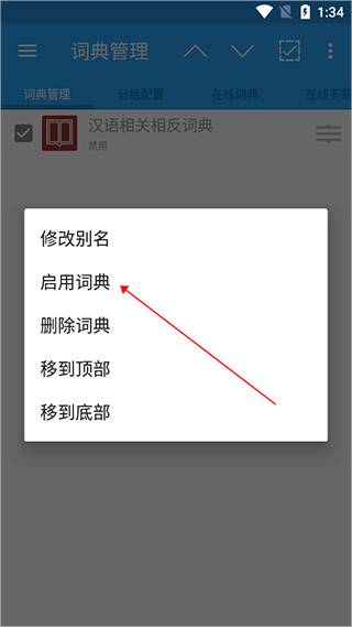 4. 下载完成后,点击顶部导航栏的词典管理,在弹出页面长按已下载词典后选择启用词典