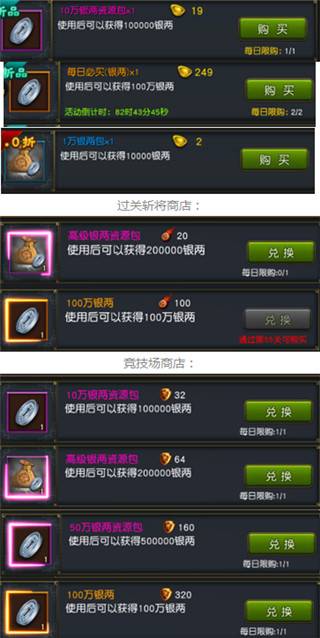4、 通过横扫挑战里面的战役可以很好的获得银两,而在过关斩将里面,每一关过完五关得到的宝箱里面可以开出很多很多的银两,而且在过关斩将里面也可以用横扫,并且也不消耗士兵,当这些方法都尝试过还缺银两我们可以去商店里面,花元宝等的货币来购买。商店:过关斩将商店:竞技场商店:打开军功宝箱获得大量银两