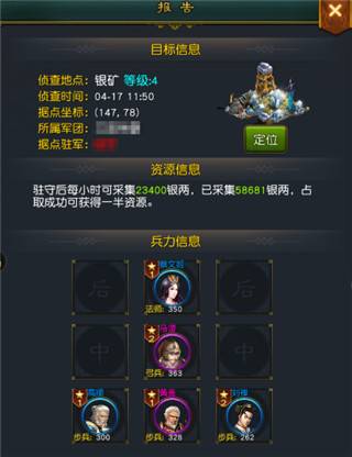3、 有一个高级银矿就会每小时给我们提供很多银两,一个正在被人开采的银矿被我们打败之后就会直接获得当前敌人开采总量的一半银两,只是这种方法会消耗我们大量精力去探查,所以我很强势的推荐一个快速获得银两的方法,那就是去挑战