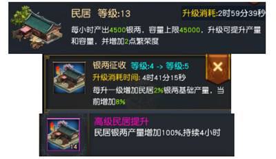 1、 第一点就是升级建筑,升级官府就能解锁更多的民居,然后升级民居获得银两,等民居升级到一定程度的时候就能收获银两了,根本就不需要做什么,只需要去科技里把银两征收升级就行了,还能用道具民居来获得更多的民居。
