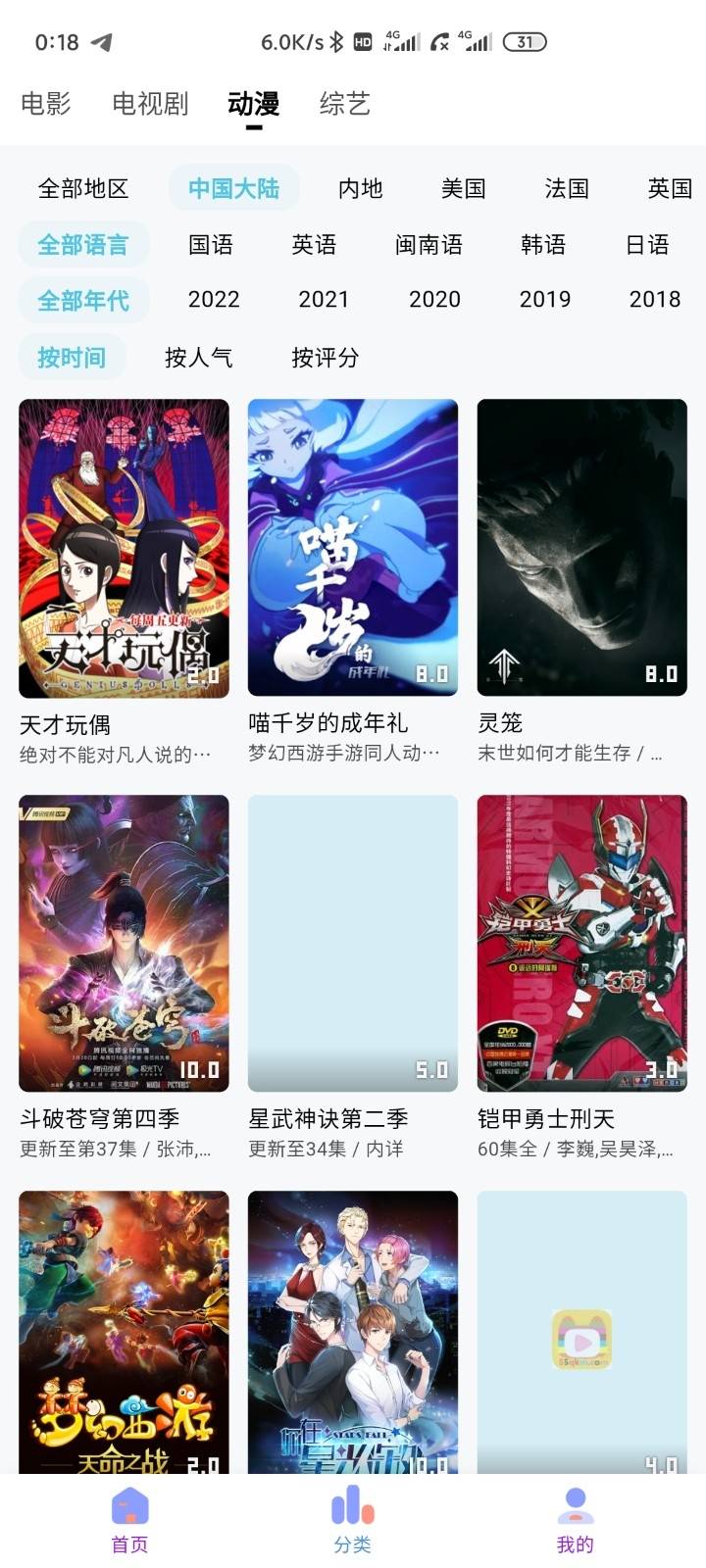 分类包含爱情,青春,科幻,悬念,校园,历史等等类别,动漫番剧的分类很全面。
