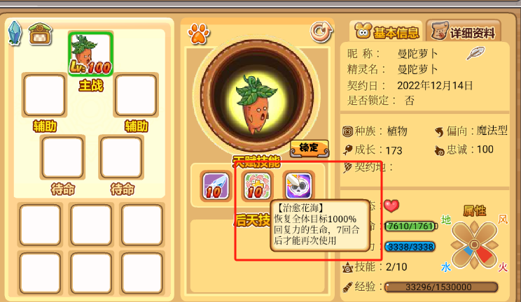 1、这里有一只曼陀萝卜100级的辅助宠物,它非常常见,自带技能“治愈花海”。
