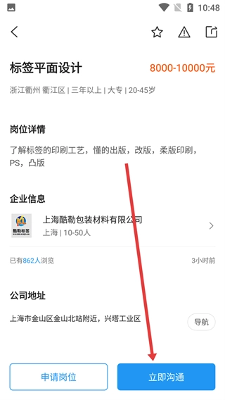 4. 进入岗位详情页面,点击【立即传达】按钮,就可以与企业HR就岗位相关事宜展开交流,进而促使求职流程得以推进。