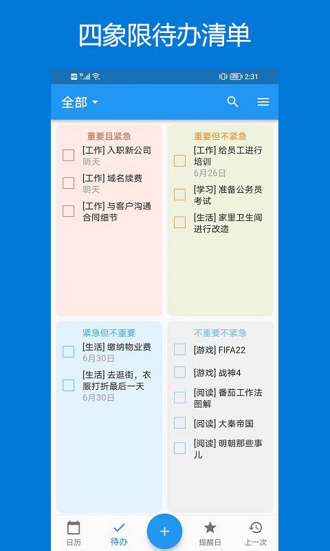 让你高效执行关键事务,系统给予列表视图或者四象限视图来浏览待办事项清单,而且可以为每个待办事项开启番茄时钟。