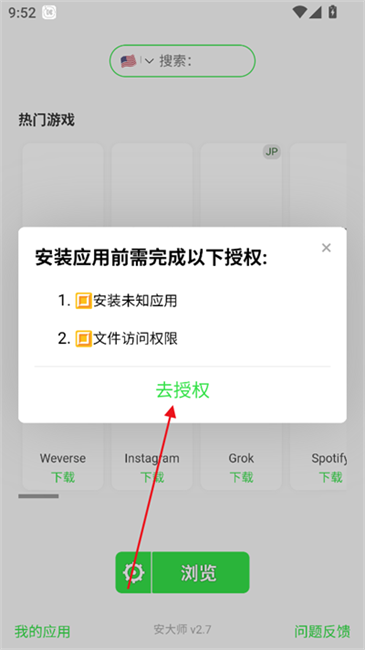 1、打开安大师xapk安装器,点击开启相关授权。