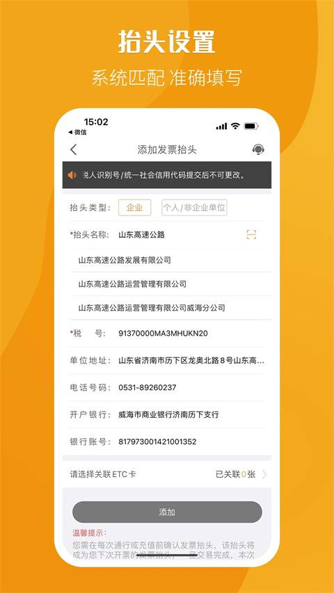 具有添加、查看、关联发票抬头的功能,帮你轻松管理ETC卡。