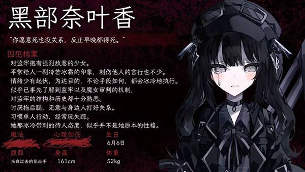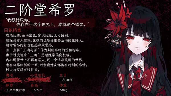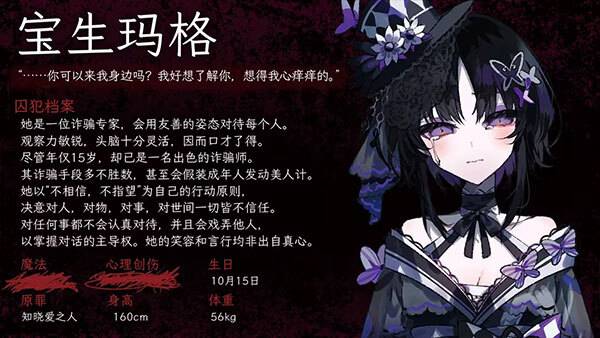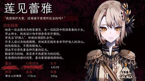 平时给人感觉很冷淡,有时会说出伤害别人的话,他的情绪很少波动,只要想达成目标,就不顾一切地去做到,好像提前知道监狱和魔女审判的规则一样。