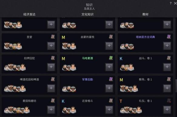 要购买语言书,K大多是战斗技巧相关的内容,M包含教导与智力开发方面的书籍,V则是种田时所需的生活技能类书籍,T关乎游说和礼仪知识。