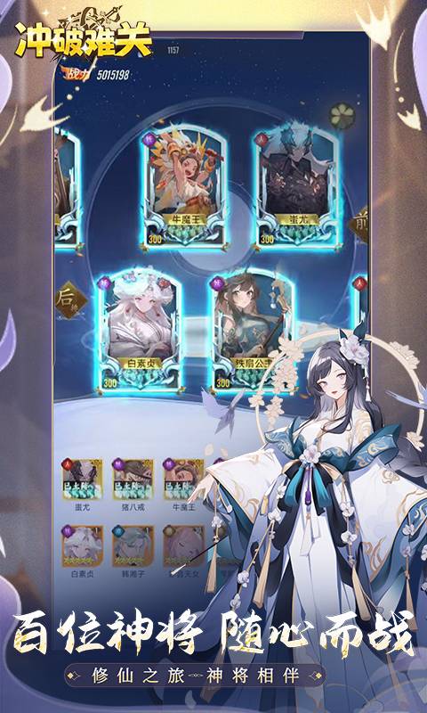 冲破难关的上百位神话神将,全部拥有独立的立绘、技能设计与背景故事,没有同质化的换皮角色,每个神将都有专属的定位与用法,阵容搭配的自由度极高。