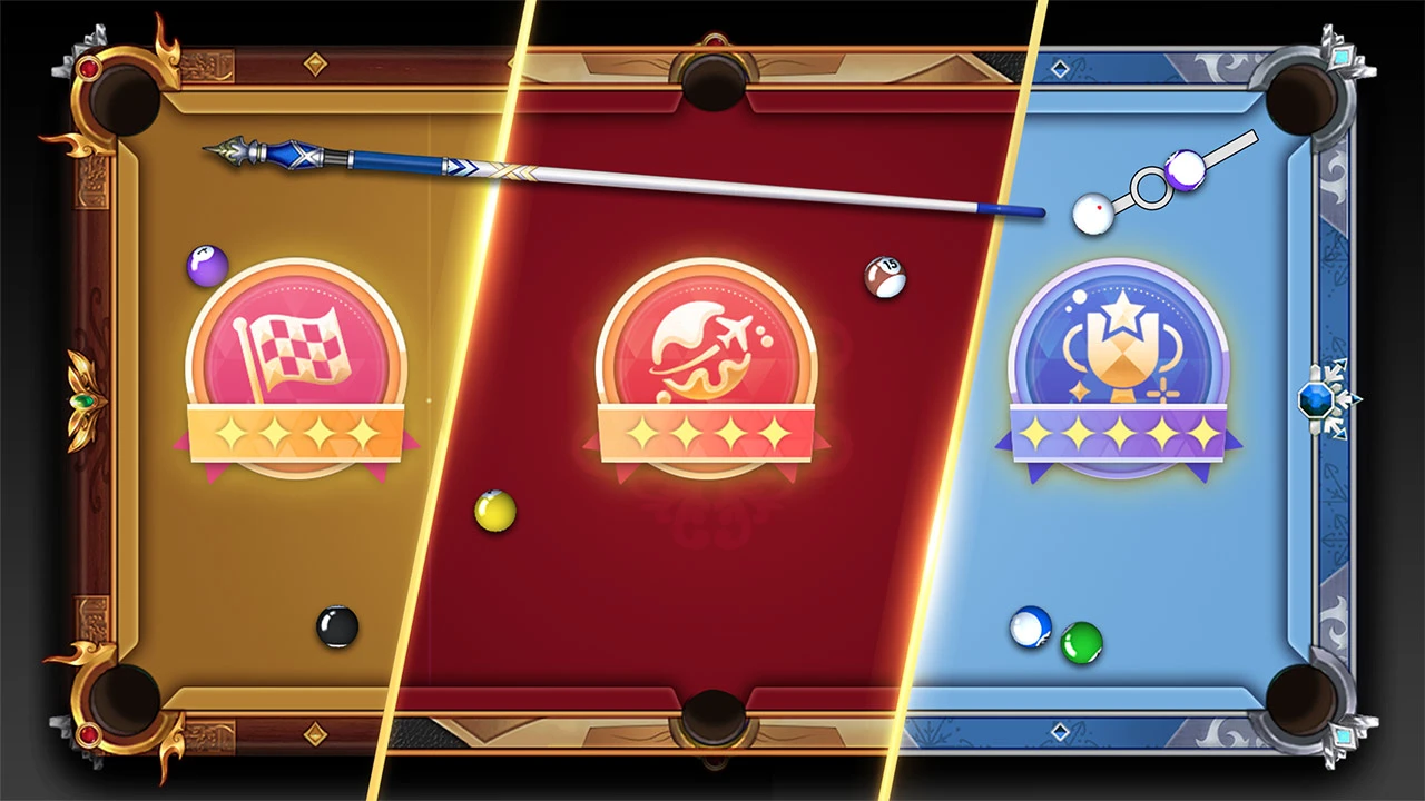 核心 1v1 匹配模式,系统会根据玩家的段位与实力,实时匹配同水平的真人玩家,采用标准中式八球规则,先打进己方全部花色球,再将 8 号球打入指定袋口的玩家获胜,获胜可提升段位与赛事积分。