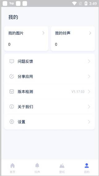 点击底部我的板块,可集中管理已下载的图片、铃声等个人资源,同时可完成问题反馈、版本检测、系统设置等操作