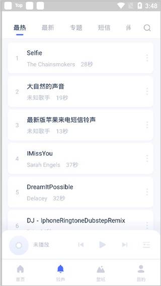 切换至铃声板块,可按最热、最新、专题、短信等分类浏览铃声资源,支持在线试听、下载与自主裁剪,编辑完成后可直接设置为手机来电或短信铃声