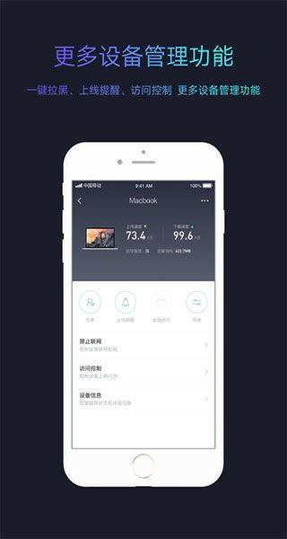 设备管理方面,用户可针对单个设备设置上传/下载带宽上限,也能直接禁止其联网