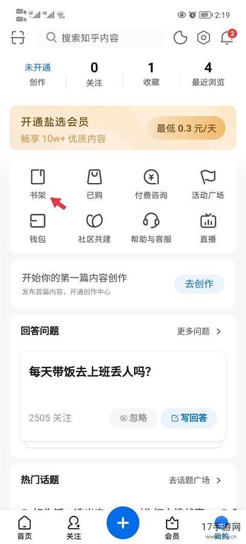 1、进入到知乎软件之后点击书架。