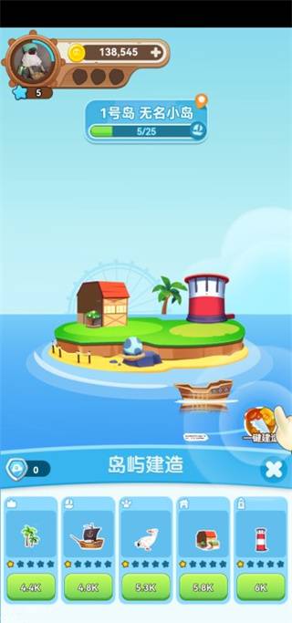 岛屿建造逻辑:用转盘获取的金币,升级岛屿上的 5 个建筑,每个建筑升满 5 级,整座岛屿建造完成,即可解锁下一座新岛屿,开启新的冒险。