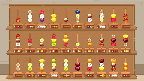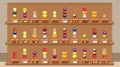核心是水果版水排序逻辑,通过拖拽交换竹签上的水果,把相同颜色的水果串成统一果串,达成关卡目标即可通关