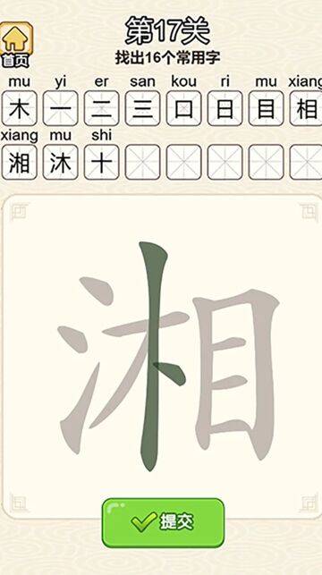 答:第 17 关是从 “湘” 字中找出 16 个常用字,标准答案为:木、目、相、日、口、十、一、二、三、人、八、湘、沐、林、不、卜。
