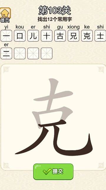 找字玩法:核心考验玩家的观察力与汉字辨识度,需要在给定的复杂汉字或字符阵列中,找出关卡要求数量的常用字,比如从 “戴”“亩”“湘” 等单字中,拆解出十余个独立常用汉字,是游戏最核心的闯关模式。