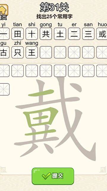答:第 31 关核心是从 “戴” 字中找出 25 个常用字,标准答案包含:十、土、王、共、田、三、或、戈、一、二、口、日、目、八、大、人、廾、弋、戴、木、才、中、千、里。