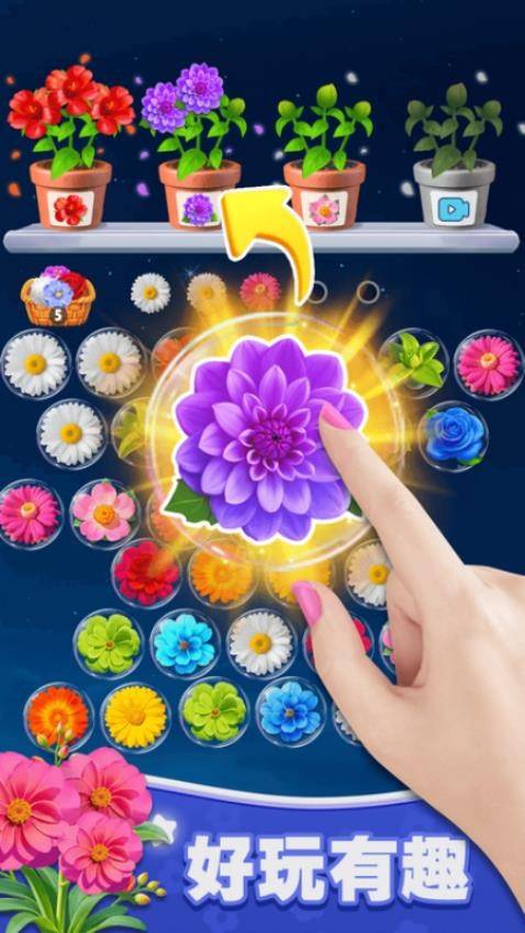 基础消除:主界面密密麻麻全是花朵气泡,找到三个相同花卉比如向日葵、蓝色妖姬、粉色玫瑰点击它们自动移入花盆,凑齐三朵触发绽放特效完成一轮消除