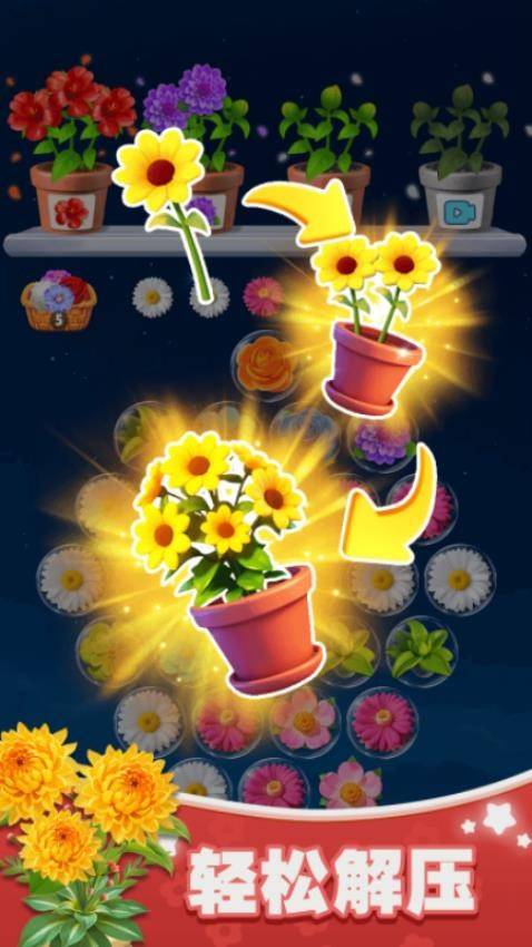 不是合成玩法,是匹配消除,集齐三个相同花朵移入花盆就能完成一轮消除,花朵之间不存在合成升级机制