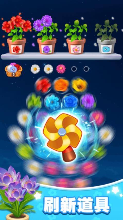 道具三件套救命,刷新打乱所有花位、清除一键抹掉危险花朵、提示免费给最优解,关键时候能翻盘