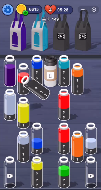 变色瓶机制打破惯性思维,普通瓶子只让倒同色有些瓶子自带变色规则,你以为只能往红瓶倒红的结果倒错一步全盘重来,烧脑度直接拉满