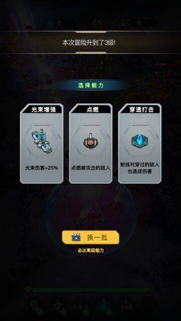 每波战斗结束后随机解锁技能或装备,逐步强化飞船战力,打造专属战斗流派